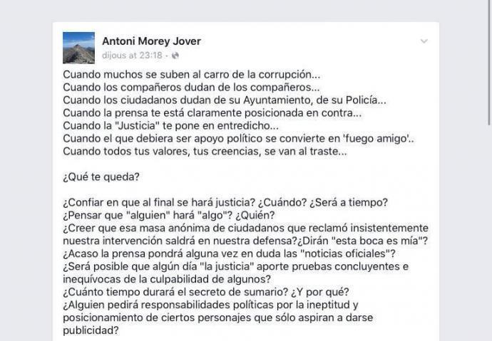 Antoni Morey Jover, fins ara cap de la Policia Local de Palma, arremetia, en una carta oberta a Facebook, contra la justícia, els polítics i defensava l’actuació dels agents investigats per corrupció, fins i tot dels que són a la presó.