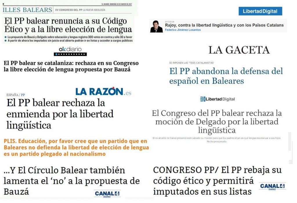 Unanimitat a la premsa espanyolista: el PP de les Illes Balears ha virat cap allò que ells consideren 'catalanisme'. La premsa madrilenya no ha digerit bé que els congressistes del PP derrotassin, per una immensa majoria, les tesis de secessionisme lingüístic impulsades pel tàndem Bauzá-Delgado. Els titulars d'aquest diumenge són antològics.