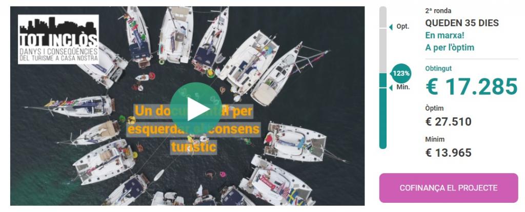 El dimarts 17 d’octubre es va assolir el primer objectiu de la campanya de microfinançament del futur documental Tot inclòs: Danys i conseqüències del turisme a casa nostra. Varen arribar als 13.965 euros que, com a mínim, feien falta per assegurar poder-lo fer.