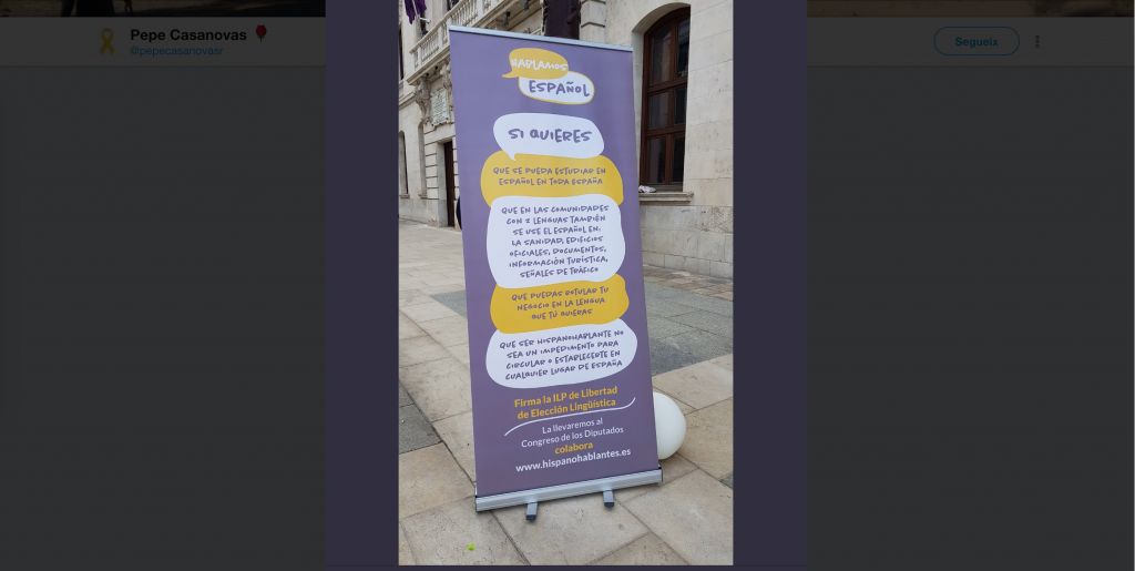 Estic a Burgos. Recollida de signatures per a fer una ILP per acabar amb la immersió a l'escola catalana. He parlat, amb els membres de la taula petitòria i el que defensen és que el català quedi reduït a una llengua per parlar-la únicament a casa. pic.twitter.com/DOQYn73QOw