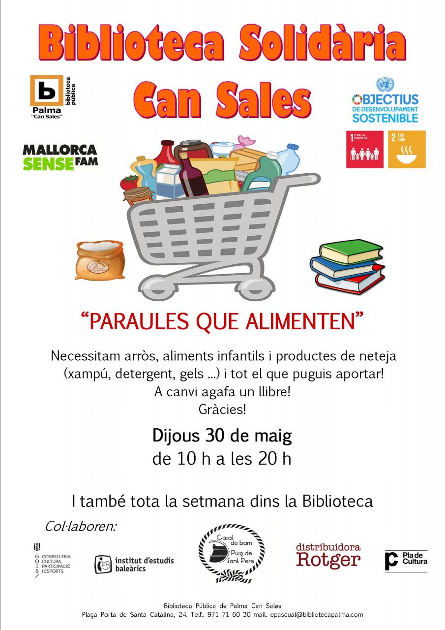 La biblioteca pública de Palma Can Sales, juntament amb l'ONG Mallorca Sense Fam, organitza per cinquè any consecutiu l’activitat solidària 'Paraules que alimenten', que compta amb el suport de la Conselleria de Cultura, Participació i Esports, a través de l'Institut d'Estudis Baleàrics (IEB). Aquesta activitat pretén aconseguir aliments que s’intercanviaran per llibres donats per la biblioteca als usuaris que participin.