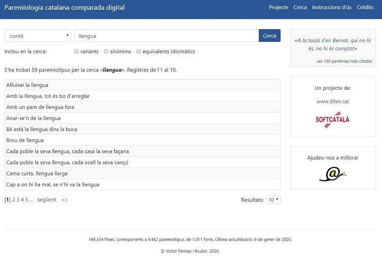 Disponible en línia una nova eina per a consultar un corpus fraseològic de la llengua catalana. És un projecte del lingüista i paremiòleg vallromaní, Víctor Pàmies i Riudor, desenvolupat per Pere Orga, informàtic de Softcatalà. Aquesta obra està sotmesa a les condicions de la llicència Creative Commons Atribució-NoComercial-CompartirIgual 4.0 Internacional.