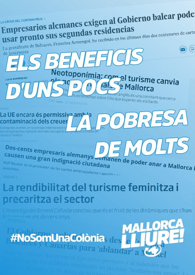 «Ningú sap amb certesa a què ens abocarà aquesta crisi sanitària que ja comença a fer palès també una crisi econòmica. El que és segur, emperò, és que serà un punt d'inflexió: o ens dirigim al col·lapse rotund o remam fort per canviar de sentit». En aquest sentit, han criticat l'allau de peticions per part d'inversors i empresaris alemanys per acudir a les segones residències de Mallorca. I han recordat que Mallorca «és un país del Mediterrani on hi vivim persones tot l’any. Abans que lloc d’estiueig, és un lloc on s’hi desenvolupa la vida, i aquesta hauria de ser la principal prioritat de qualsevol política pública». «En cap cas, es pot posar en perill la salut dels mallorquins, per davant de qualsevol interès econòmic estranger», expliquen.