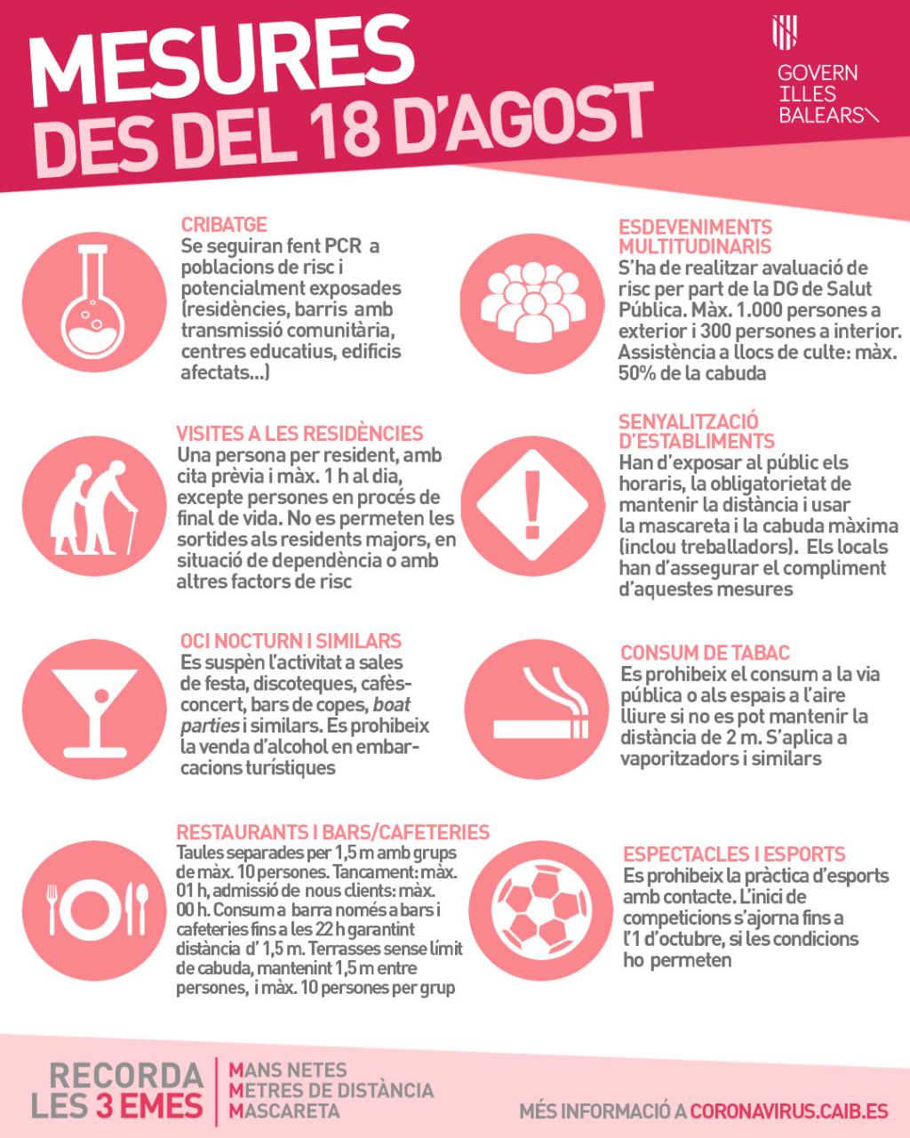 El Govern ha explicat que les restriccions per la Covid-19 acordades divendres entre les comunitats autònomes i el govern espanyol s’aplicaran des d'aquest dimarts, 18 d'agost. A més, ha anunciat algunes mesures extres que també es publicaran al Butlletí Oficial de les Illes Balears (BOIB).