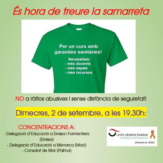 La Unió Obrera Balear, sectorial d'Ensenyament, convoca concentracions a Eivissa, Mallorca, Menorca aquest 2 de setembre, perquè considera que les darreres millores anunciades per la Conselleria són «totalment insuficients» i «no garanteixen la reducció de les ràtios d'aula». «La manca d'espais, docents i recursos ens aboca a un curs educatiu amb gran perill de contagis i rebrots, i exigim a Educació que rectifiqui amb una inversió de xoc immediata», han denunciat.