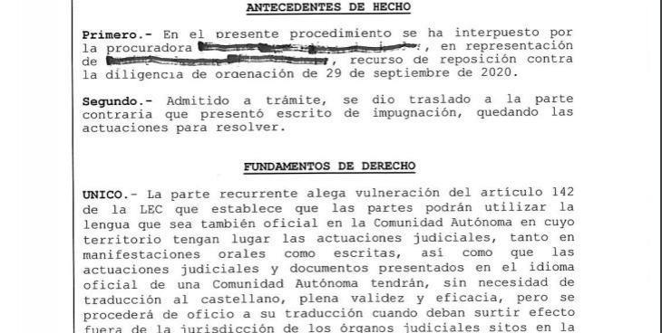 La Lletrada admet que s'havia vulnerat l'article 142 de la Llei d'Enjudiciament Civil que les parts podran usar qualsevol de les llengües oficials a la Comunitat en el territori de la qual es facin les actuacions.