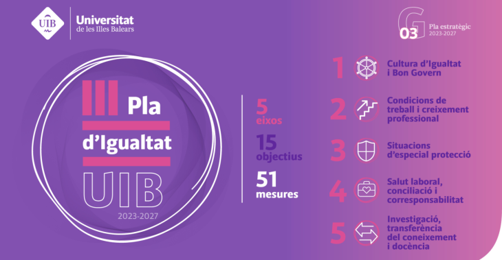 La Universitat de les Illes Balears (UIB) ha activat el III Pla d'igualtat entre dones i homes per al període 2023-2027 i reafirma el compromís amb la igualtat de gènere. Aquesta iniciativa s'emmarca en els objectius del Pla estratègic de la UIB i respon a les exigències de la normativa en matèria d'igualtat i, sobretot, al compromís de la Universitat amb els drets humans, el foment de la igualtat d’oportunitats entre dones i homes i la lluita contra qualsevol tipus de discriminació.