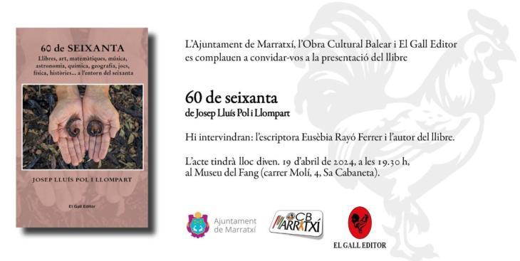 Aquest divendres, dia 19 d’abril, tendrà lloc la presentació del llibre 60 de seixanta (El Gall Editor, 2023) de Josep Lluís Pol i Llompart al municipi de Marratxí, concretament al Museu del Fang (carrer Molí, 4 de sa Cabaneta). L’acte serà a les 19.30 hores i hi intervendran l’escriptora Eusèbia Rayó Ferrer i l’autor del llibre.