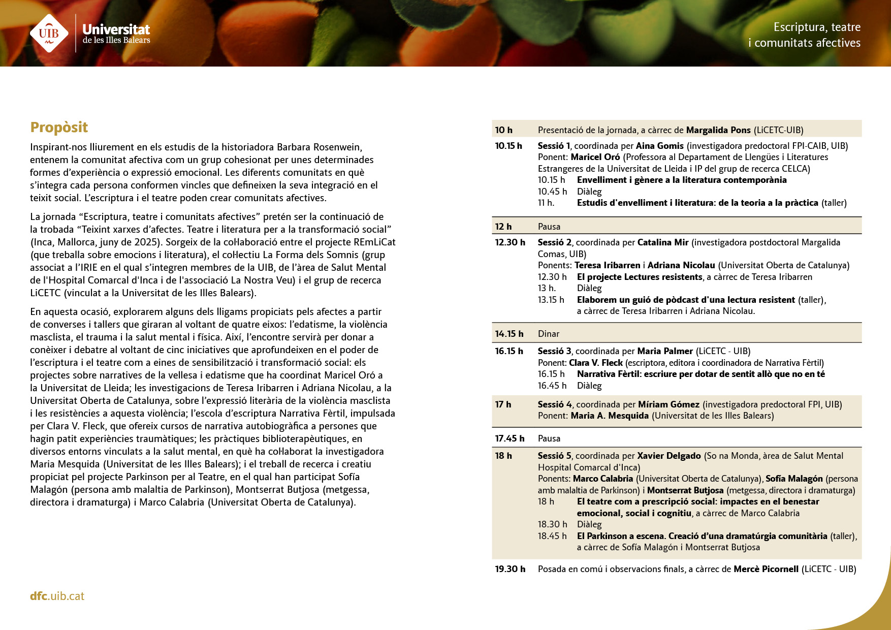 La jornada donarà continuïtat a experiències prèvies com la trobada 'Teixint xarxes d’afectes' celebrada a Inca el mes de juny passat. El projecte s’inspira lliurement en els estudis de Barbara Rosenwein, tractant la comunitat afectiva com un teixit de vincles emocionals que la literatura i el teatre poden contribuir a crear. Aquestes recerques permeten dissenyar metodologies creatives i educatives que converteixen l’art en una eina d’intervenció directa sobre problemàtiques reals, i obren camins per a la reparació, la inclusió i la cohesió social.