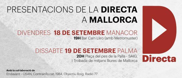 El mitjà de comunicació La Directa ha organitzat per aquest cap de setmana dues presentacions a Mallorca, a Manacor i Palma. Aquest mitjà, en català, d'actualitat, investigació, debat i anàlisi, va néixer l’any 2006 i compta amb més de 2.000 subscriptors que donen suport al projecte.