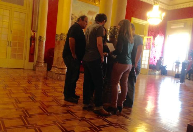 A mig matí, membres de les dues formacions es reunien durant poc més de vint minuts a la Sala Verda de l’hemicicle per escoltar una nova proposta de la formació morada per tal d’arribar a un acord que permeti una candidatura conjunta.