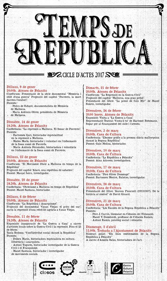 L'Ateneu de Felanitx organitza juntament amb els Amics dels Closos de Can Gaià i Felanitx per la igualtat un cicle d'actes sota el lema 'Temps de República'.