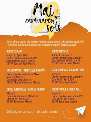 «Una carta és una finestra més enllà dels murs. Segur que els agradarà llegir-vos. Recordeu posar el remitent!». Aquest és el motiu que ha animat l?ANC (Assamblea Nacional Catalana) a fer una crida a tots els ciutadans a enviar cartes de suport als presos polítics. Com expliquen, és important posar el remitent.