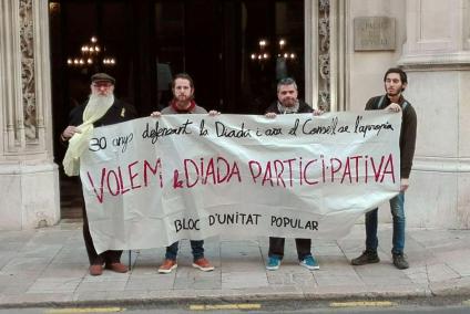 Aquest dilluns, el Bloc d’Unitat Popular (BUP) ha desplegat una pancarta amb el lema 'Volem la Diada participativa!' davant de l’edifici del Consell de Mallorca per tal de denunciar «l’intent del Consell d’apropiar-se de la Diada obviant els agents, les persones i els moviments que durant trenta anys han defensat i dignificat la Diada».