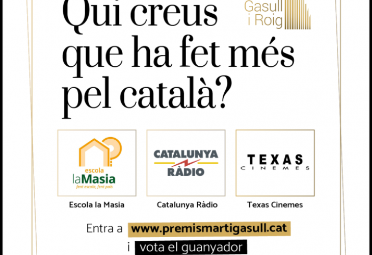 El jurat dels V Premis Martí Gasull i Roig ha fet públics, aquest dimarts, els tres finalistes a aquest guardó que reconeix la trajectòria i les accions que han fet persones i entitats en la defensa i la promoció de la llengua catalana. En aquesta ocasió, els finalistes són Catalunya Ràdio, els Cinemes Texas i l'escola La Masia de l'Horta valenciana. Els nou membres del jurat han deliberat sobre les 539 candidatures que es varen proposar al premi i han valorat el fet que totes hagin tengut un bon nivell de defensa i promoció del català.