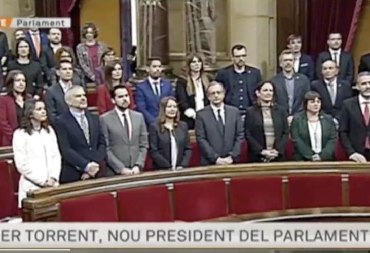 Aquest dimecres s?ha constituït la mesa del Parlament de Catalunya amb Roger Torrent com a President. En el final del debat de constitució del nou Parlament, la majoria dels diputats de la institució s?han aixecat per cantar ?Els Segadors? (himne nacional de Catalunya). Els que no l?han cantat han estat els diputats de Ciudadanos, que s?han quedat drets i de braços caiguts.