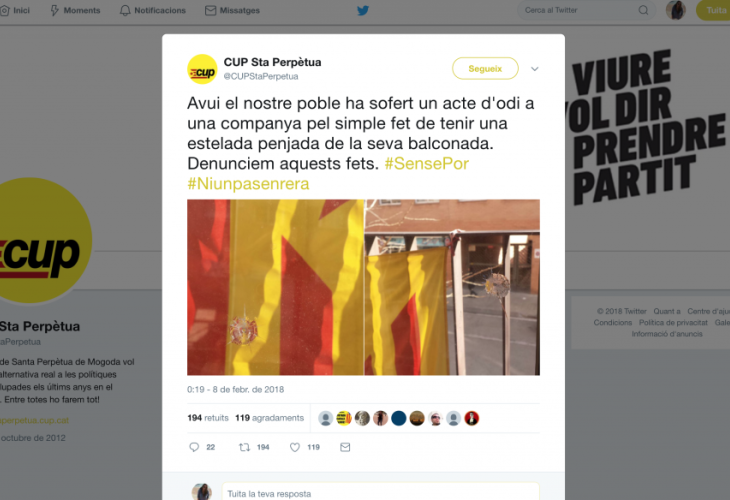 Una veïnada del poble barceloní Santa Perpètua de Mogoda ha denunciat haver rebut trets de balins al seu balcó per tenir-hi una estelada penjada.