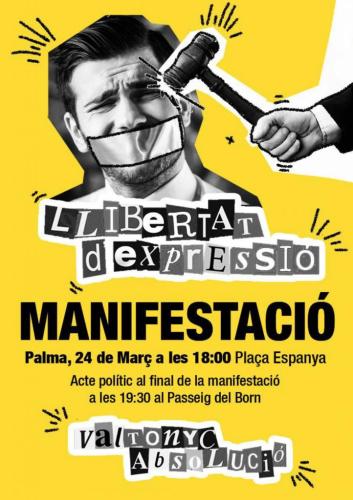 Per al proper dissabte 24 de març s’ha convocat una manifestació per la llibertat d’expressió i absolució de Valtonyc. Mentre el raper és a l’espera de l’auto d’ingrés a presó per la condemna de tres anys i mig per les lletres de les seves cançons, el Grup de suport llibertat Valtonyc anuncia «la gran manifestació».