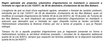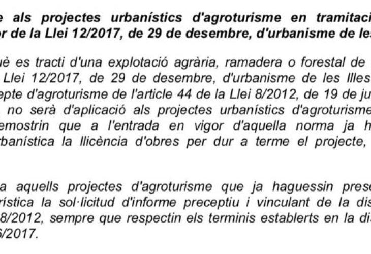 L'exigència de què es tracti d'una explotació agrària, ramadera o forestal de caràcter preferent, introduïda per la Llei 12/2017, de 29 de desembre, d'urbanisme de les Illes Balears, quan va modificar el concepte d'agroturisme de l'article 44 de la Llei 8/2012, de 19 de juliol, de Turisme de les Illes Balears, no serà d'aplicació als projectes urbanístics d'agroturismes en tramitació o execució que demostrin que a l'entrada en vigor d'aquella norma ja havien sol·licitat a l'Administració urbanística la llicència d'obres per dur a terme el projecte, o que ja l'havien obtingut.
