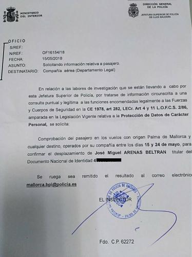 La Policia espanyola ha fet arribar una carta a totes les companyies aèries que operen a l'aeroport de Son Sant Joan de Palma, en la qual sol·licita informació sobre els desplaçaments que ha fet el raper Josep Miquel Arenas, conegut amb el nom artístic de Valtonyc.