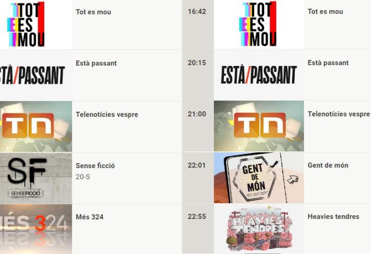 En qualsevol cas, aquest migdia a la programació que publica la web de TV3, el canal mare té previst oferir a les 22:05 el documental, mentre que a TV3.CAT a les 22:05 hi ha previst el programa 'Gent de Món'.