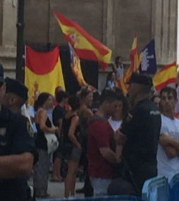 Als espanyolistes congregats davant el Palau de l'Almudaina per aplaudir el rei espanyol no els agrada que IB3 existesqui. Aquest divendres vespre han assetjat la periodista que havia de cobrir les connexions en directe, fins al punt que una de les connexions previstes no s'ha pogut fer.