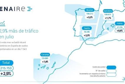 El centre de control de Palma ha augmentat un 0,9 per cent el nombre de vols gestionats al juliol, fins als 47.234 moviments, segons les dades publicades per AENA.