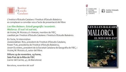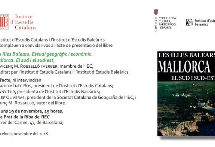 Fruit de la col·laboració entre l’Institut d’Estudis Catalans i l’Institut d’Estudis Baleàrics, s’ha publicat en català 'Les Illes Balears. Estudi geogràfic i econòmic. Mallorca. El sud i el sud-est', del geògraf i membre de la Secció de Filosofia i Ciències Socials de l’IEC Vicenç M. Rosselló Verger.