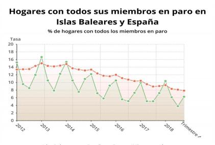 Les llars de les Balears amb, almenys un actiu i tots els membres a l'atur, varen arribar als 22.700 en el quart trimestre de l'any 2018, un 6,2 % del total, segons l'Enquesta de Població Activa (EPA) publicada aquest dimarts pel Institut Nacional d'Estadística.