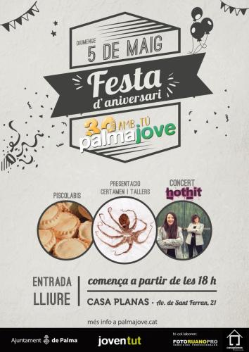 El servei municipal Palmajove celebrarà aquest diumenge que compleix 30 anys, i ho farà amb una festa a l’Espai Casa Planas (Av. Sant Ferran, 21). Es durà a terme un concert del grup Hot Hit, que interpretarà temes de soul, rock i blues; a més, es faran tallers creatius i el certamen artístic, tot acompanyat prèviament per un piscolabis. La festa començarà a les 18 hores i serà gratuïta per a tothom.