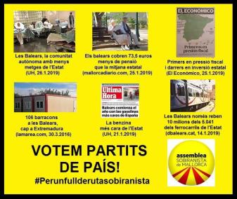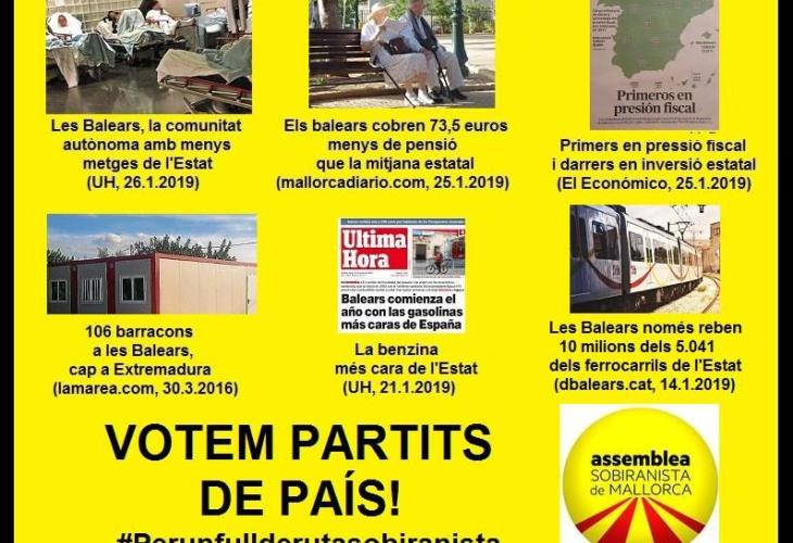 L'Assemblea Sobiranista de Mallorca fa una crida a acudir a les urnes a les properes eleccions autonòmiques, locals i europees i votar partits polítics de país, és a dir, «aquells que prenen les decisions a ca nostra i no dirigits des dels despatxos de Madrid, i posen per endavant els drets i el benestar de les Balears i Pitiüses, víctimes de l'explotació colonial i l'espoli fiscal de l'Estat espanyol». «Recordam, una vegada més, que segons les balances fiscals reconegudes pel Ministerio de Hacienda el 14,20% del PIB balear se'n va a Madrid cada any i no torna, una quantitat al voltant dels 4.200 milions d'euros que suposa gairebé la meitat del pressupost autonòmic», han remarcat.