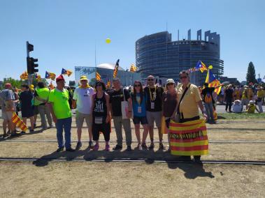 Una trentena de mallorquins varen participar, aqúest dimarts, a la concentració davant la seu del Parlament europeu d'Etrasburg, per protestar per l'exclusió de tres eurodiputats elegits democràticament a l'Estat espanyol i als quals no es deixa accedir al seu escó.