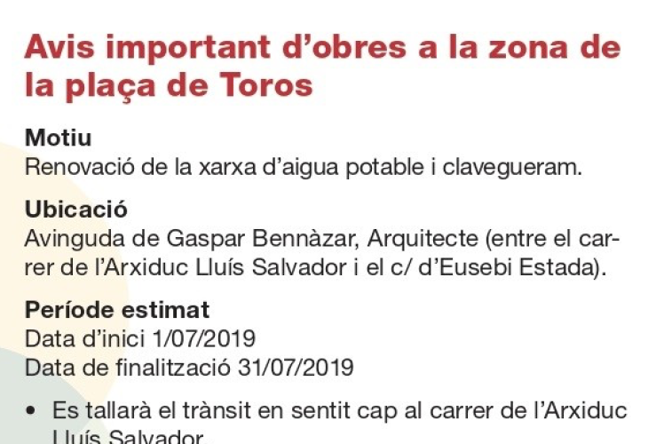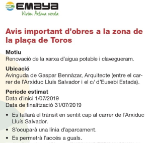 Emaya ha informat del tancament, a partir d'aquest dilluns, de l'avinguda Gaspar Bennàzar Arquitecte a l'altura dels carrers Eusebi Estada i Arxiduc Lluís Salvador per obres de renovació en la xarxa d'aigua potable, uns treballs que mantindran tancada l'avinguda fins el 31 de juliol.