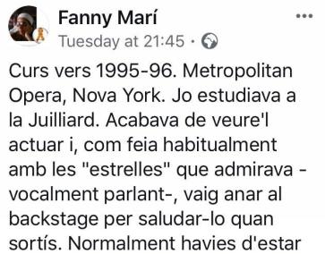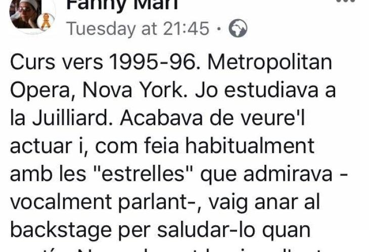 La soprano i professora de cant mallorquina, Fanny Marí, ha fet pública a través del seu compte de FaceBook l'experiència que va viure en conèixer el tenor espanyol, Plácido Domingo, a la Metropolitan Opera de Nova York.