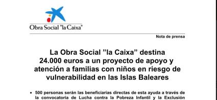 L'Obra Social 'la Caixa' ha anunciat, a través del seu potent departament de comunicació, que destinarà un total de 24.000 euros a 500 famílies «amb nins en risc o situació d'exclusió social als barris del Molinar, Coll d'en Rabassa, Arenal de Palma i Llucmajor, a través d'un projecte impulsat per 'Espiral-Entitat Prestadora de Serveis a la Joventut'.»