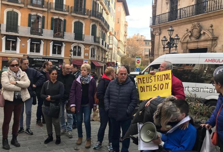 Una vintena de persones s'han concertat aquest dimecres a les 11.00 hores a la plaça de Cort, convocats per Stop Desnonaments Mallorca, per a protestar pel tracte rebut per part de les administracions públiques en el desnonament d'aquest dimarts a Santa Catalina i, així mateix, per les càrregues policials i la detenció del portaveu de la plataforma, Joan Segura, durant la manifestació que ho impedia.