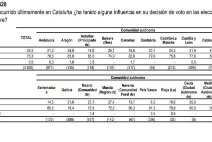 Un 25,1% d'electors de les Illes Balears afirma, segons l'avanç del baròmetre del Centre d'Investigacions Sociològiques (CIS), que el que ocorria a Catalunya va influir en la seva decisió de vot en les eleccions del passat 10 de novembre, mentre que el 74,9% sosté que no va influir en el seu vot.