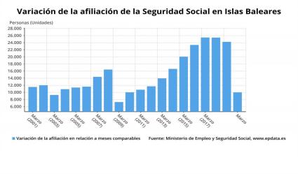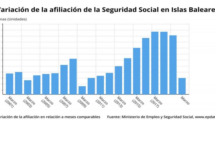 La Seguretat Social va comptabilitzar a les Balears un total de 451.696 afiliats en el mes de març, el que representa una caiguda interanual de l'1,38%, amb 6.323 treballadors menys que fa un any, segons dades del Ministeri de Treball, Migracions i Seguretat Social publicats aquest dijous.