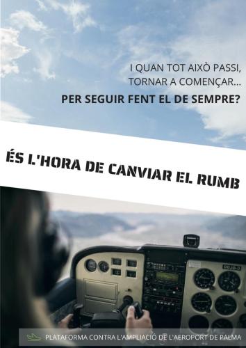 La Plataforma contra l’Ampliació de l’Aeroport no cessa la seva activitat tot i el confinament i llança la campanya 'És hora de canviar de rumb!' a les xarxes socials. «Sabem que ara, i donades les circumstàncies derivades de la Crisi Sanitària de la COVID, la tramitació dels projectes d'AENA resta paralitzada i les obres que ja s'havien començat a l'aeroport també. Però sabem que, un cop acabi el confinament, la voluntat política de 'rellançar' l'economia turística a les Balears pot pegar una empenta a tot el que sigui la indústria de l'aviació i les infraestructures associades», han explicat.