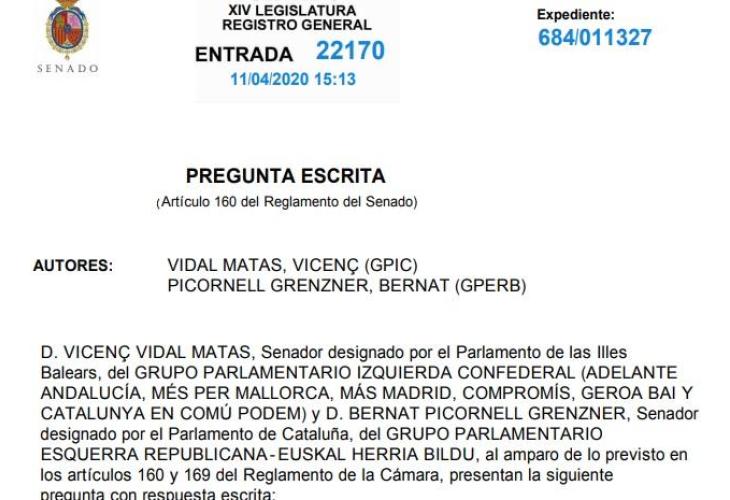El Senador designat pel Parlament de les Illes Balears, Vicenç Vidal i el Senador designat pel Parlament de Catalunya, Bernat Picornell, han presentat diverses preguntes sobre el cas de discriminació lingüística que va denunciar el president de l'Obra Cultural Balear, Josep de Luis.