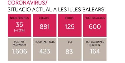 Així mateix, s’han comunicat 7 defuncions i el total acumulat és de 125 morts. Fins ara, s’han registrat 1.606 casos acumulats, 35 més que aquest dimarts, la qual cosa representa un increment del 2,2 %.