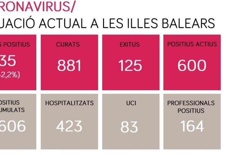 Quant a la situació en els hospitals, a Mallorca hi ha 359 persones hospitalitzades, 66 de les quals es troben en unitats de cures intensives. La resta de persones, 648, reben atenció per part de les unitats d’atenció al coronavirus.