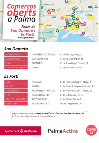 PalmaActiva està elaborant llistes de les diferents zones de Palma, on constin tots els comerços de la ciutat que romanen oberts durant l'estat d'alarma decretat per mor de la COVID-19. Amb aquesta iniciativa, que es difon a través de les xarxes socials, el consistori cerca donar a conèixer a la ciutadania alternatives comercials a les grans superfícies, apostant pel comerç local i de proximitat.