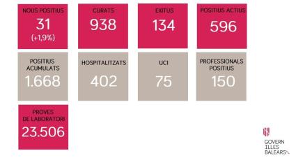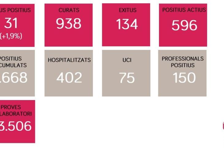 Així mateix, s’han comunicat 3 defuncions i el total acumulat és de 134 morts. En total, s’han duit a terme 23.506 proves de laboratori (21.923 PCR i 1.583 tests d’anticossos). En les darreres 24 hores, s’han detectat 31 casos nous, la qual cosa representa un increment de l’1,9 % sobre els 1.668 casos acumulats.