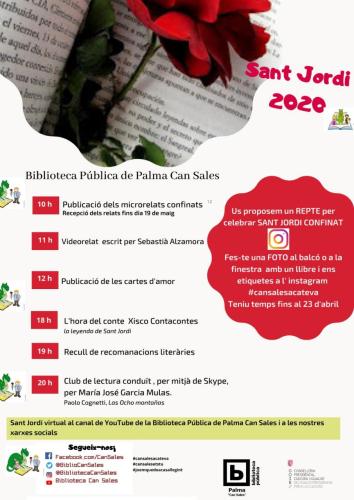 A més, a les 12 hores, es penjarà a les xarxes una de les cartes rebudes en el XV concurs de Cartes d'Amor de Can Sales. A les 18 hores, Xisco Contacontes llegirà el conte La llegenda de Sant Jordi perquè nens i adults coneguin l'origen de la celebració de la festa del llibre. A les 19 hores serà el torn de les recomanacions literàries a través del programa Carrousel. Escriptors, lectors i usuaris de la biblioteca compartiran les seves lectures durant el confinament: Ester Cifre parlarà de Morta de pipida de Llorenç Villalonga; Sonia Castello ha triat Suite Francesa d'Irène Némirovsky; mentre que Vicky Jiménez explicarà les claus de Reina Roja, el fenomen literari de Juan Gómez Jurado.