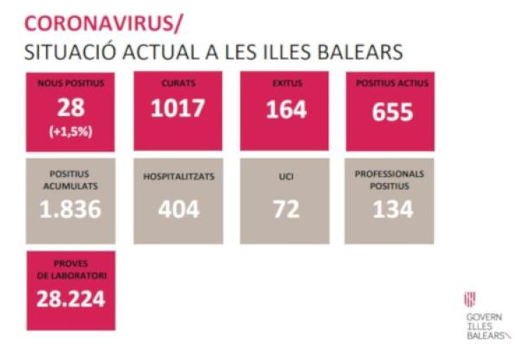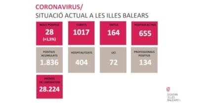A les Illes Balears hi ha 655 casos positius actius de SARS-CoV-2, d’acord amb les dades del Ministeri de Sanitat, és a dir, 13 més que ahir. Així mateix, s’han comunicat 3 defuncions i el total acumulat és de 164 morts. En total, s’han duit a terme 28.224 proves de laboratori (25.862 PCR i 2.362 tests d’anticossos).
