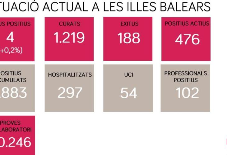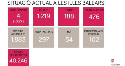 A les Illes Balears hi ha 476 casos positius actius de SARS-CoV-2, d’acord amb les dades del Ministeri de Sanitat, és a dir, 22 menys que ahir. D’altra banda, 1.219 persones s’han curat.