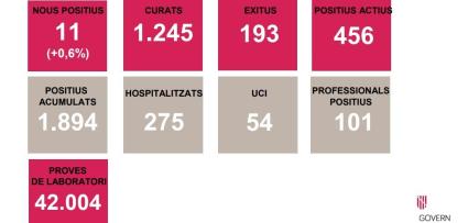 Així mateix, s’han comunicat 5 defuncions i el total acumulat és de 193 morts. En total, s’han duit a terme 42.004 proves de laboratori (37.180 PCR i 4.824 tests d’anticossos). En les darreres 24 hores, s’han detectat 11 casos nous, la qual cosa representa un increment del 0,6 % sobre els 1.894 que hi ha en total.