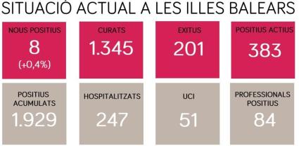 A les Illes Balears hi ha 383 casos positius actius de SARS-CoV-2, d’acord amb les dades del Ministeri de Sanitat, és a dir, 18 menys que ahir. D’altra banda, 1.345 persones s’han curat.