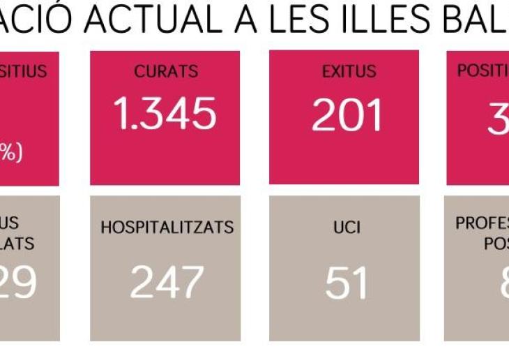 Des que va començar l’epidèmia, s’han detectat un total de 339 casos positius entre els professionals que fan feina en els centres sanitaris, el 17 % dels 1.929 casos que s’han detectat en total a les Illes fins ara. De tots aquests casos, a hores d’ara hi ha 84 professionals sanitaris que són positius actius, xifra que representa el 0,5 % dels 16.000 professionals que fan feina a la sanitat de les Illes Balears. Un total de 153 estan en vigilància activa.